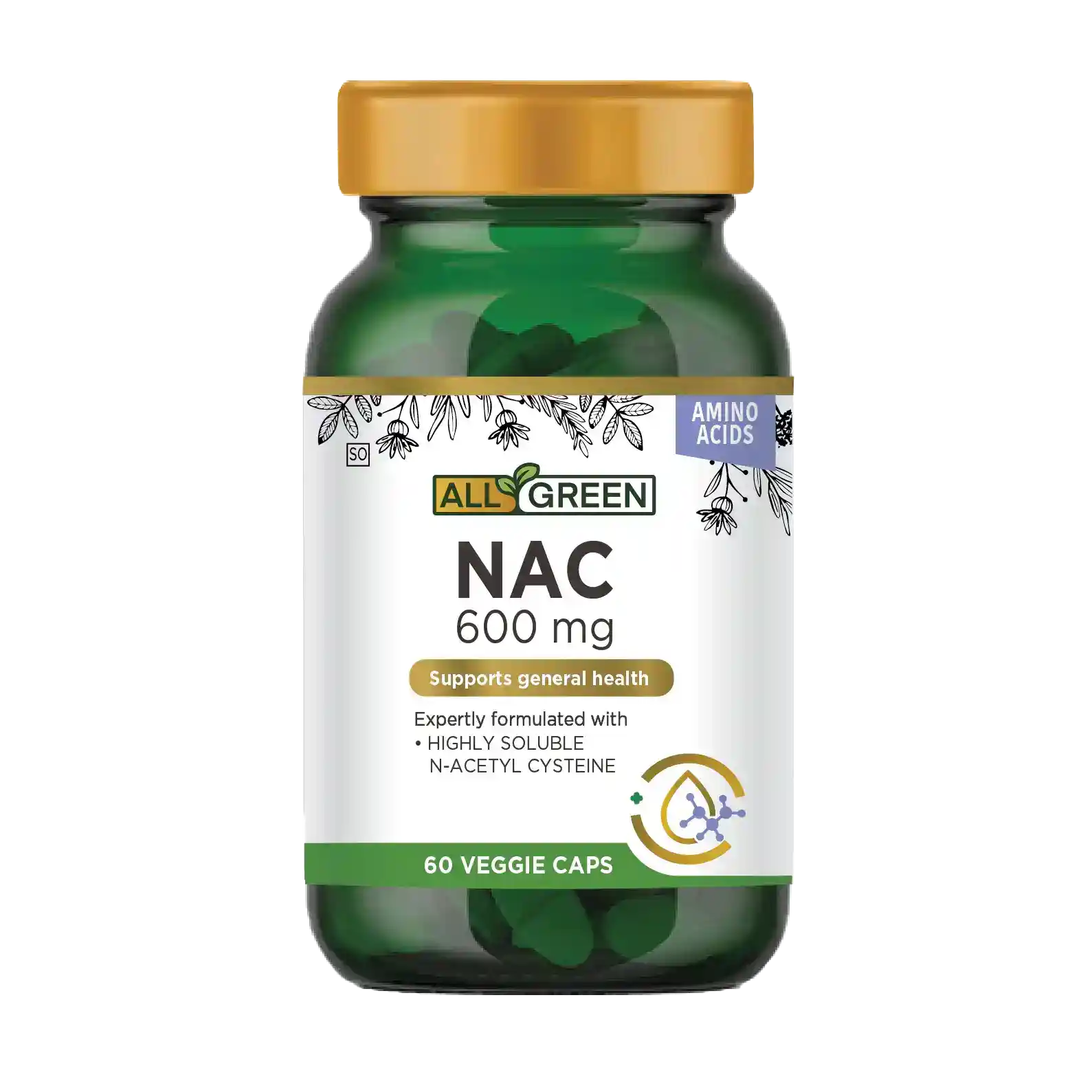 All Green NAC provides 600 mg of N-acetyl cysteine per capsule. NAC is an amino acid precursor that may support cellular health and detoxification and, as an antioxidant, it may support protection against oxidative stress. NAC may thin and loosen mucous in the respiratory tract and support a healthy respiratory system.