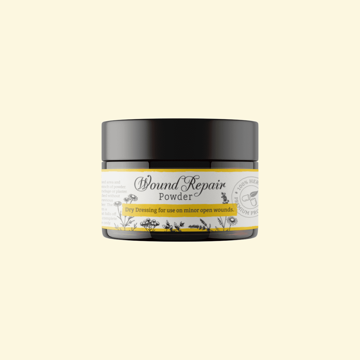 Dry dressing for use on minor open wounds. A gentle botanical powder to support the natural healing of minor wounds, cuts, and abrasions. Formulated to create a protective layer over the skin while encouraging healing and combatting infection. Directions: Clean the affected area and apply a liberal dusting of powder. Cover with a bandage or plaster. Reapply as needed without removing the previous powder layer. The powder will form a natural scab that falls off once healing is complete. For external use only. Ingredients: Comfrey Root powder, Slippery Elm Bark powder (Ulmus Rubra), Myrrh powder, Bayberry Root powder, and Garlic powder. Storage: Store below 25°C. Keep out of reach of children. Avoid contact with eyes. Additional Information: